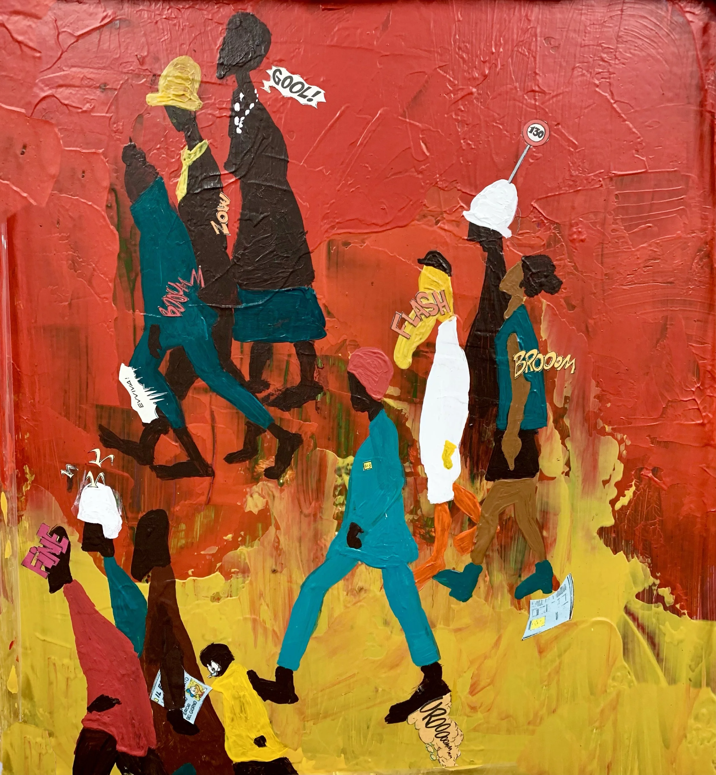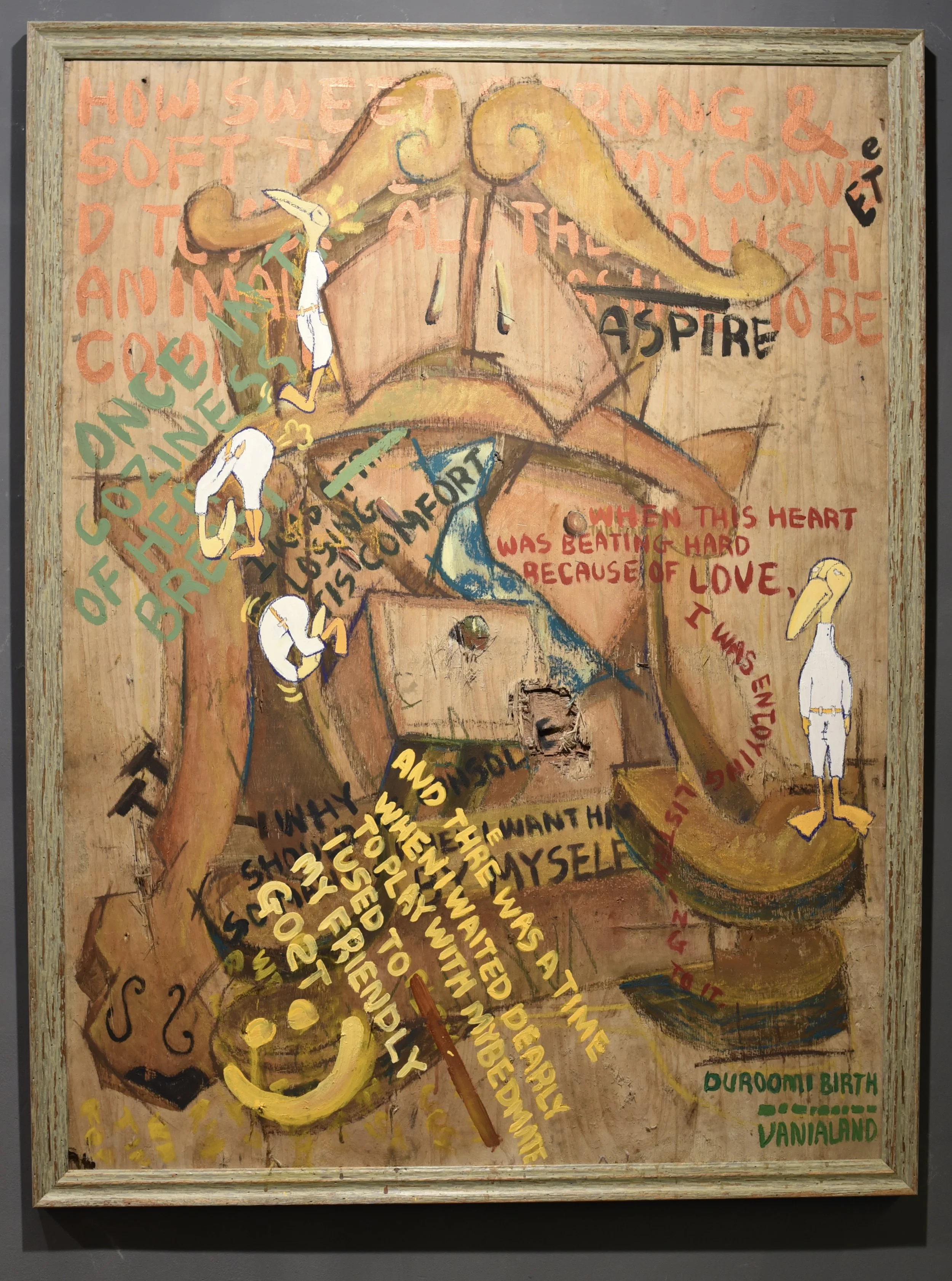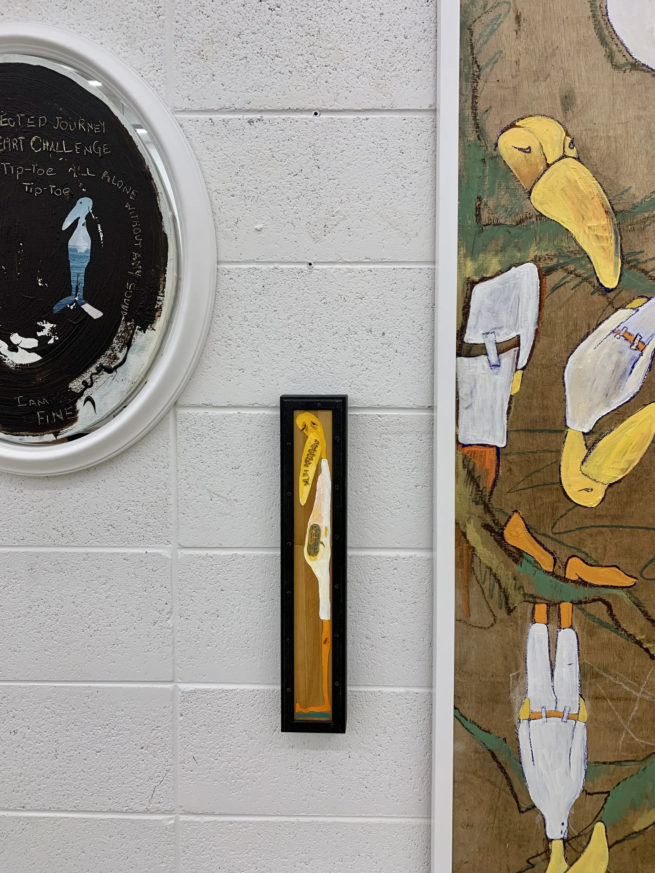 2021 | 손바느질 한 코스튬, 주은 나무판자에 유화와 파스텔 | 설치